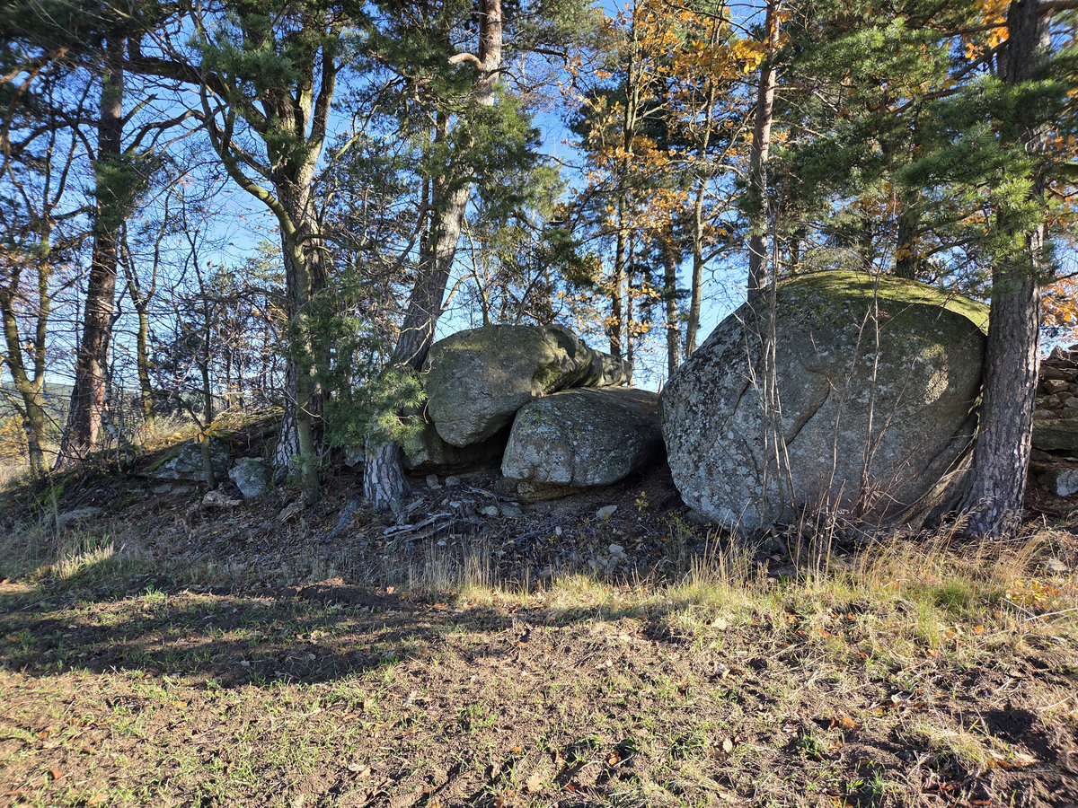 Po přechodu louky přicházím do obce Heinrichs bei Weitra, natočím krátké video pro YouTube a pokračuji k místní zajímavosti – žulovým kamenným útvarům, jež každý nese vlastní jméno a váže se k němu vlastní legenda. V podstatě jde o nepovinnou odbočku z trasy, ale po prozkoumání skalek a skalních studánek tuto odbočku všem v duchu vřele doporučuji. Při kontrolním pohledu do mapy se pokouším přečíst názvy jednotlivých kamenů a vrcholů. S množstvím dvojitých w, zdvojených písmen, přehlásek a délek slov až mimo screen zjišťuji, že dnes budu mít povídání do kamery ohledně názvů jednotlivých míst asi složitější. Nevadí. Vím, že po cestě je vrchol Hut a tam si reputaci s názvoslovím určitě napravím :D