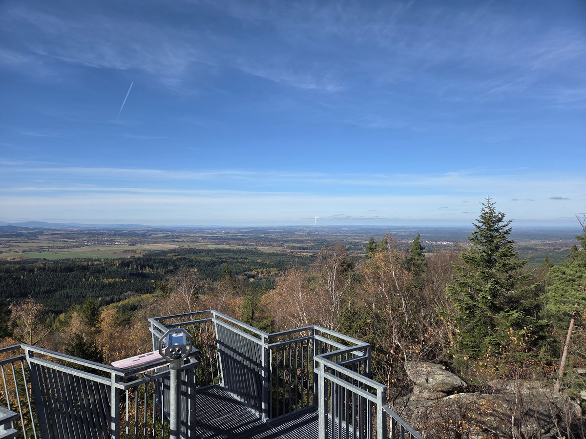 Pokračuji dále po červené trase a přecházím Sonnenstein a Schöpfsteine. Místy se občas dokonce mezi stromy vyloupne nějaký ten výhled. Podzim je právě v té nejhezčí fázi, počasí je nádherné a já si užívám vůni lesa a spadaného listí, které příjemně šustí pod nohami. Pomalu se blížím k Mandelsteinu a začínám v hlavě přemítat, kolik lidí asi bude na vrcholu. Vrchol a vyhlídka jsou totiž velmi dobře přístupné – cesta z parkoviště je ani ne jeden kilometr dlouhá, nenáročná a vyhlídka stojí za to. Očekávám nával.