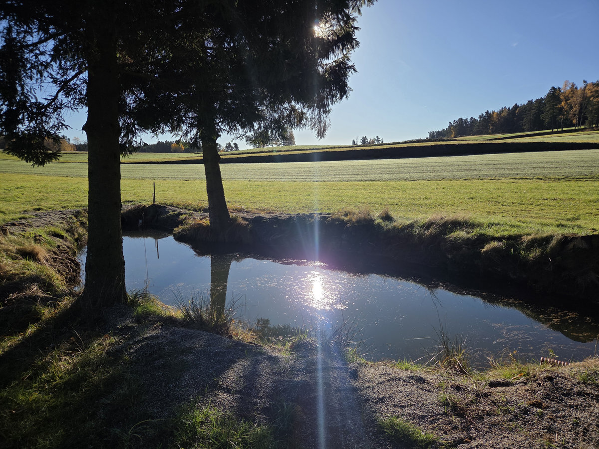 Po krátké cestě po asfaltu přicházím do vesničky Pyhrabruck. Nikde není ani noha a já tak procházím v naprostém tichu. Společně s modrou turistickou trasou se napojuji na červenou a vstupuji do lesa. Je všední den a tak při průchodu kolem Novohradského potoka přemýšlím, kolik asi dnes potkám lidí. Schválně, budu je počítat.