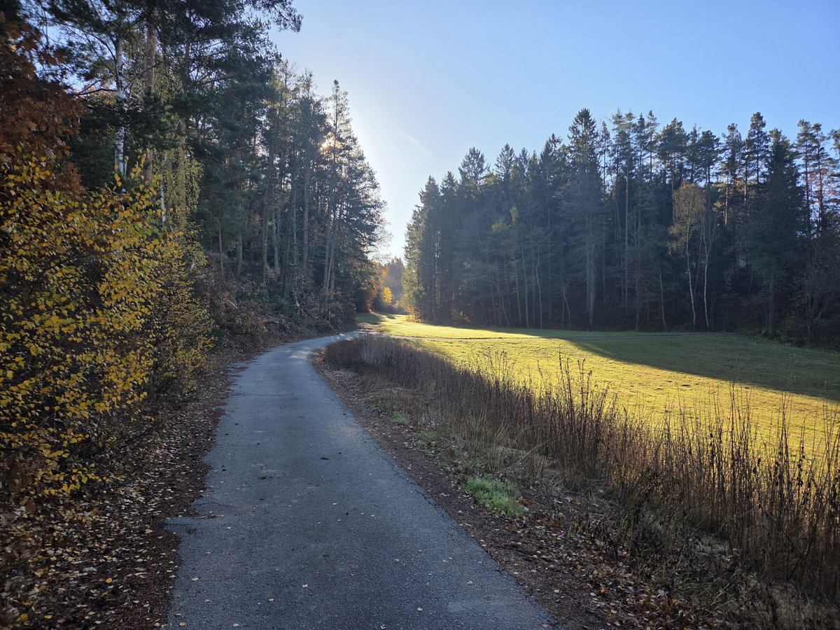 Sestup je místy docela prudký a okolní les mi připadá takový... Smutný. Nevím proč, ale jsem rád, že jsem tuto cestu nezvolil pro výstup a raději šel celý okruh obráceně. Po pár kilometrech přicházím opět na rozcestí, kde jsem se ráno napojil na Erlebnisweg Heinrichs. Odbočuji zde však doleva, nechci jít zpět cestou, kterou jsem šel již ráno. Loučím se s turistickým značením a budu pokračovat po hraniční stezce. Sluneční paprsky, jemně prosvítající mezi korunami podzimem prořídlých stromů, již začínají být dlouhé. Nezdržuji se - vím, že tohle je část lesa, kterou nechci o samotě procházet za tmy.