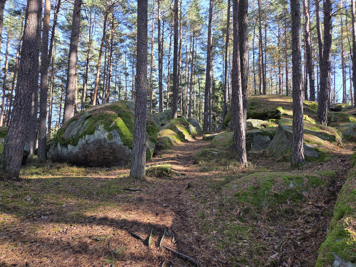 Lesní cesta vedoucí pohraničním lesem není ničím výjimečná, čímž je výjimečná. Člověk může přemýšlet. Přicházím na rozcestí, kde odbočuji a pokračuji po rakouské stezce Erlebnisweg Heinrichs. Kolem mě se začínají objevovat malé kamenné útvary jako předzvěst toho, co mě dnes čeká. Po chvilce vycházím z lesa a pokračuji otevřeným úsekem přes louku, lemovaným prvními výhledy na okolní kopce. Zastavuji na krátkou snídani v lesním remízku a v myšlenkách zaháním chuť na kávu – počkám si, vím, že to pravé místo na kávu na mě teprve čeká.