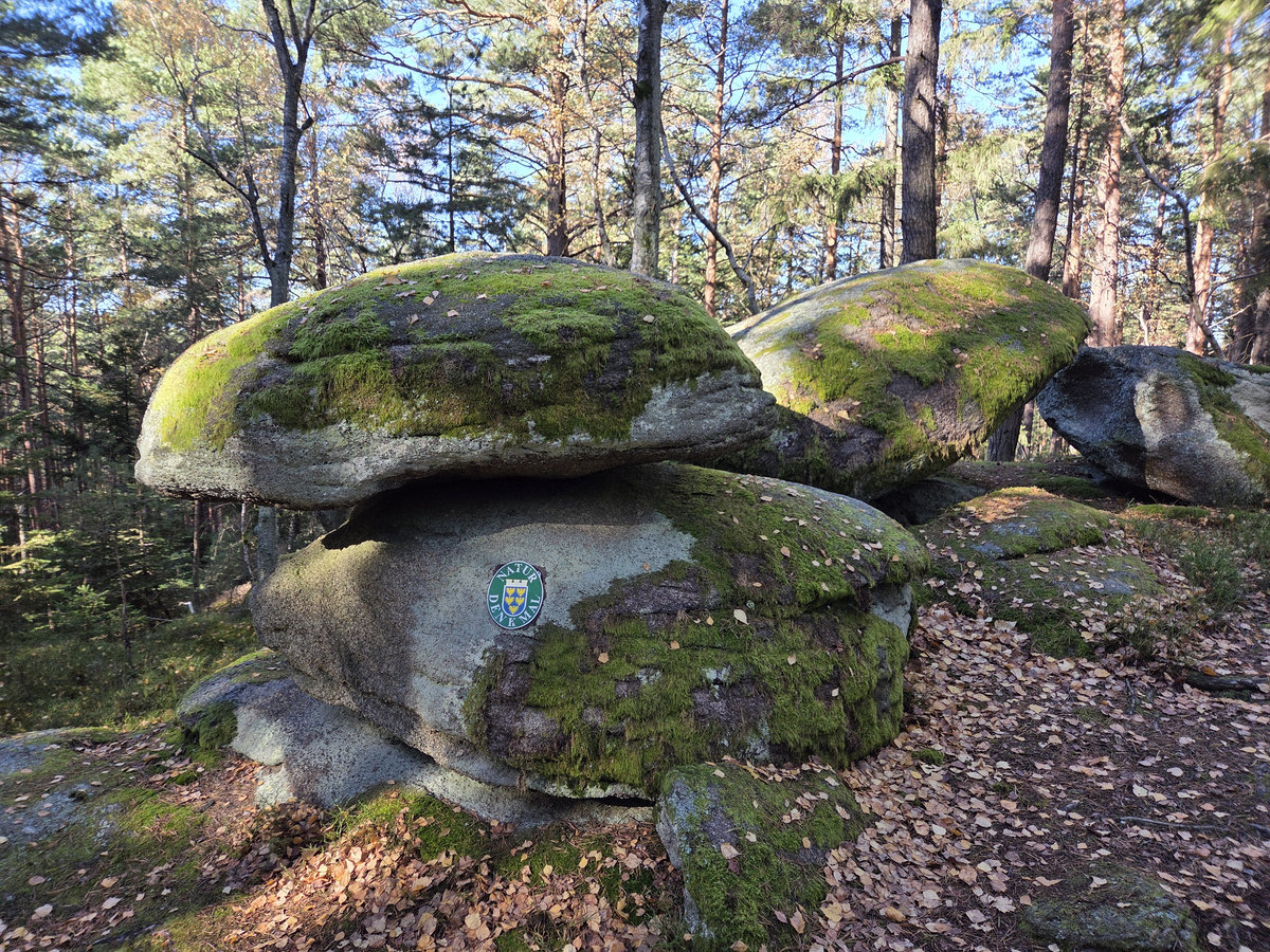Po přechodu louky přicházím do obce Heinrichs bei Weitra, natočím krátké video pro YouTube a pokračuji k místní zajímavosti – žulovým kamenným útvarům, jež každý nese vlastní jméno a váže se k němu vlastní legenda. V podstatě jde o nepovinnou odbočku z trasy, ale po prozkoumání skalek a skalních studánek tuto odbočku všem v duchu vřele doporučuji. Při kontrolním pohledu do mapy se pokouším přečíst názvy jednotlivých kamenů a vrcholů. S množstvím dvojitých w, zdvojených písmen, přehlásek a délek slov až mimo screen zjišťuji, že dnes budu mít povídání do kamery ohledně názvů jednotlivých míst asi složitější. Nevadí. Vím, že po cestě je vrchol Hut a tam si reputaci s názvoslovím určitě napravím :D