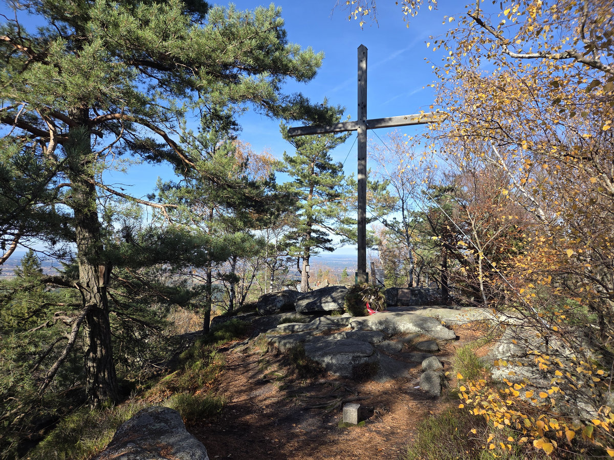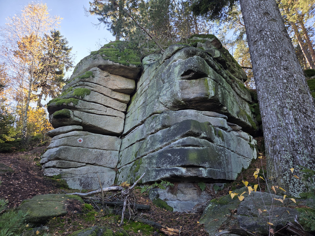 Pokračuji dále po červené trase a přecházím Sonnenstein a Schöpfsteine. Místy se občas dokonce mezi stromy vyloupne nějaký ten výhled. Podzim je právě v té nejhezčí fázi, počasí je nádherné a já si užívám vůni lesa a spadaného listí, které příjemně šustí pod nohami. Pomalu se blížím k Mandelsteinu a začínám v hlavě přemítat, kolik lidí asi bude na vrcholu. Vrchol a vyhlídka jsou totiž velmi dobře přístupné – cesta z parkoviště je ani ne jeden kilometr dlouhá, nenáročná a vyhlídka stojí za to. Očekávám nával.
