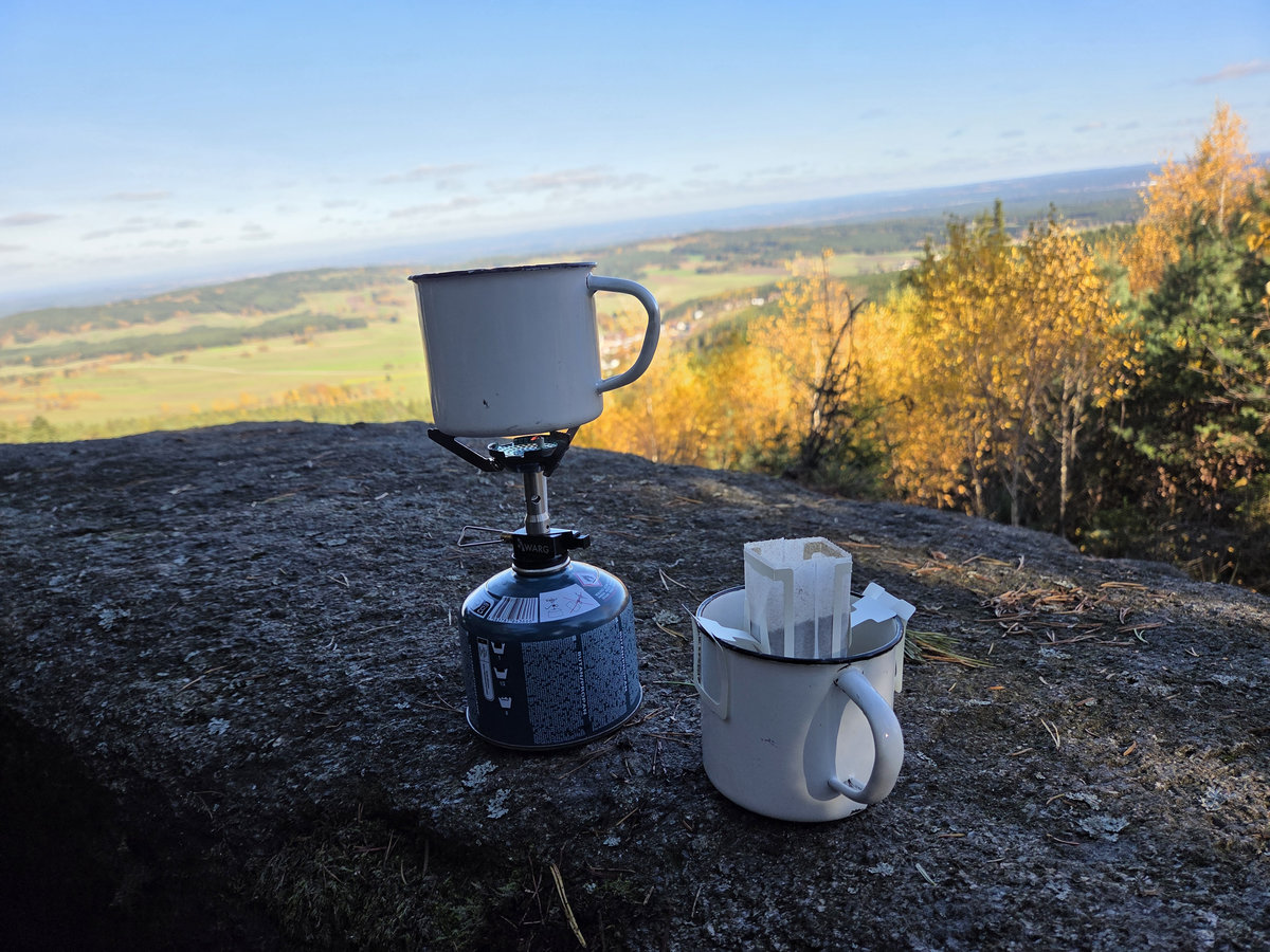 Procházím Schalenstein, Kudelring a po krátkém výstupu se zastavuji na Schinderbergu. Překrásný snadno přístupný skalní útvar s úchvatným výhledem do okolí. Ano, to je to místo, na které jsem čekal. Vytahuji vařič, vařím kávu a v zápětí si v sedě užívám horké doušky lahodného nápoje při pohledu do krajiny. Jak kouzelné a klidné místo.