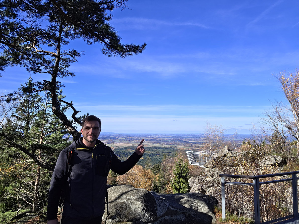 Během natáčení desetiminutového timelapse se za mě posadí postarší rakouský pár, prohodíme pár slov a já jim moc děkuji. Usadili se jen proto, aby počkali, než dokončím natáčení a nekazili mi záběr. Spontánní ohleduplnost člověka vždy potěší. I přesto se mi však do poslední minuty záběru dostávají další příchozí lidé. Nevadí mi to, to k turistice patří. Chvíli se ještě kochám výhledem na tu naši krásnou krajinu, lemovanou Novohradskými horami a chladícími věžemi Temelína, balím se a pomalu zahajuji sestup.