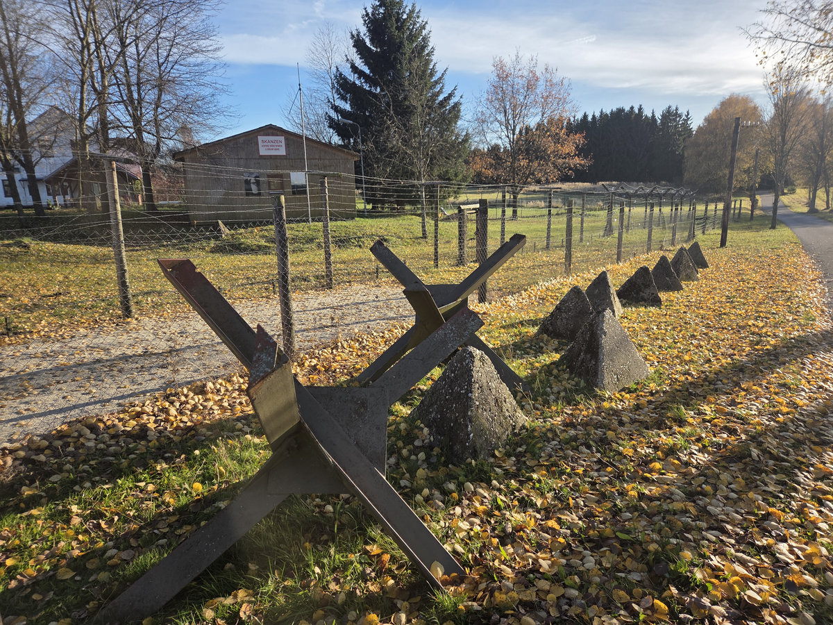 Světla je nakonec ještě dost a tak věnuji pár chvil průzkumu místnímu Skanzenu ochrany státní hranice a železné opony. Vidím rekonstrukci drátěného plotu, strážní věže a zátarasů. Je zde i malé muzeum, v tuto chvíli však není otevřeno. Není divu, rozhodně už není sezóna.